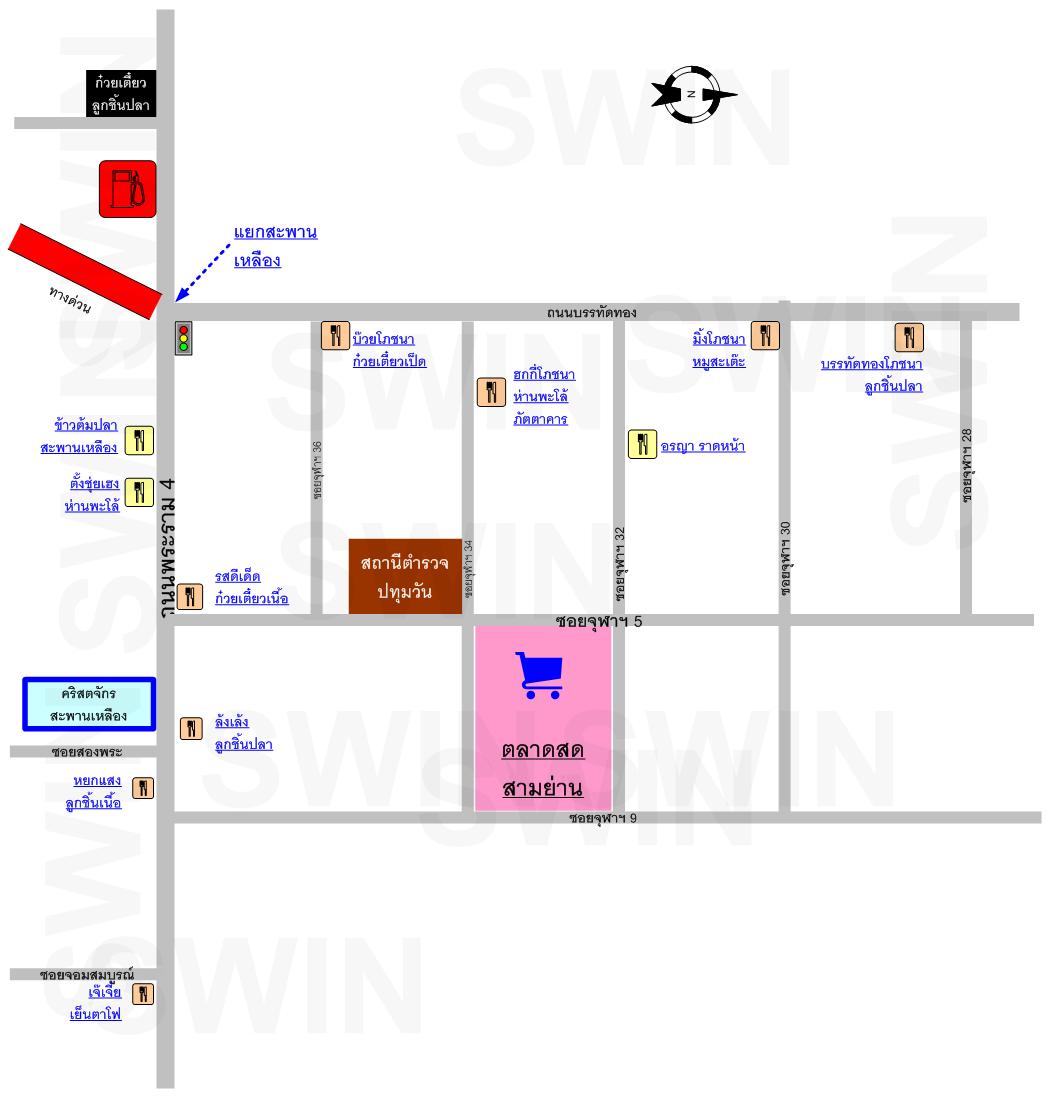 เข้าจากถนนบรรทัดทองมา 10 เมตร จะเจอร้านอยู่ซ้ายมือ (ซอยจุฬา 32 เป็นถนนวันเวย์ ห่างจากแยกสะพานเหลือง 200 เมตร)