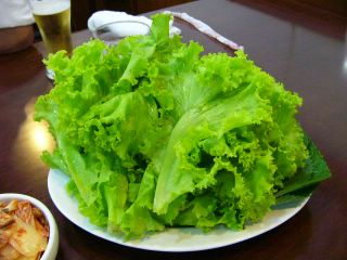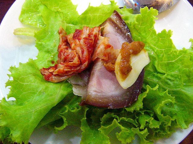วิธี ทาน ก็นำผักกาดหอมรอง นำขาหมูจ้มน้ำจิ้มมาวาง หยิบกิมจิผักกาดขาว กระเทียมสด ใส่ไปด้วย แล้วม้วนผักกาดหอมรอบขาหมู ใส่เข้าปากทาน แนมด้วย พริก ต้มหอม ตามชอบ (ดูภาพ)